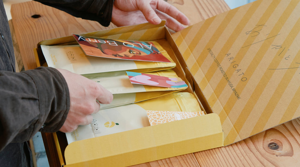 コーヒー豆は日本郵便の「クリックポスト」にて対面不要でご自宅ポストにお届けいたします。また、規定サイズを超える商品に関しましては、佐川急便、もしくは日本郵便「ゆうパック」にてお送りしております。